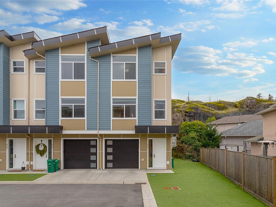 Welcome to this stunning 2020 corner townhome in Langford–Millstream neighbourhood—bright, modern and move-in ready. The open-concept main level showcases a chef-friendly kitchen with large island, tiled backsplash, gas range and abundant storage, flowing to a west-facing private patio with gas BBQ hookup and fenced yard—ideal for entertaining, kids and pets. Upstairs, the primary suite features vaulted ceilings, a generous walk-in closet and an ensuite with double sink and heated floors. Lower level offers a double-length garage for two vehicles plus versatile undeveloped space perfect for office, gym or guest suite. Bonus: Strata-approved option to fence off and incorporate the side yard for extra storage sheds or a play area. Steps to schools, parks and trails; minutes to Millstream Village, Costco and Home Depot, with an easy commute to downtown Victoria. This family-friendly complex is well run by an efficient strata and allows pets and rentals—book your showing today!