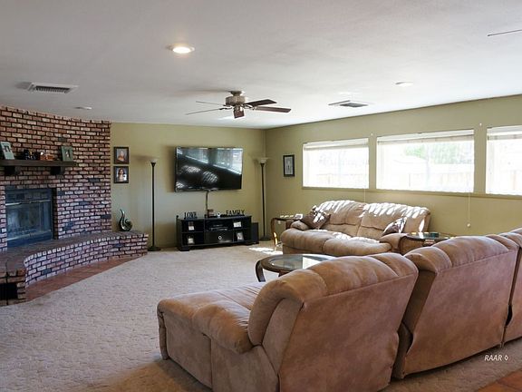 Big beautiful home in Ripley Estates!! Great for entertaining with a nice open floor plan. Enclosed courtyard with sitting area and decorative water fountain. Saltillo tiled entry with sky light. Kitchen features Saltillo tile flooring, tile counters, two ovens, two sinks, island, pendant lighting, recessed lighting and tons of cabinets. Formal dining is carpeted with newer chandelier. Living room has carpet, beautiful curved fireplace, ceiling fan, recessed lighting and custom blinds. Double door entry to huge master suite is on the main floor with carpet flooring, newer ceiling fan, custom blinds, walk-in closet and sky light. Master bath has tile flooring, tub with tile surround, recessed lighting and sky tube. Indoor laundry with lots of storage. Guest bath downstairs has tile flooring and tub/shower. Large upstairs landing can be used as a family room or kids playroom. Three guest bedrooms upstairs have carpet, lighted ceiling fans and custom blinds. Two upstairs guest baths. Newer windows. Finished two car garage with lots of storage. Balcony. RV parking with sewer. 10 X 12 Tuff Shed. Two Evap coolers. Large lot and pistachio trees. A must see!!