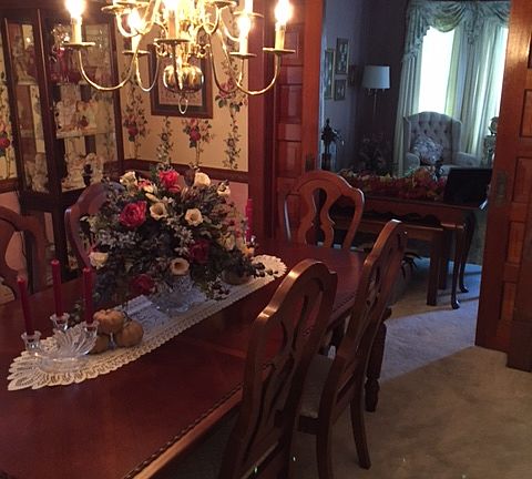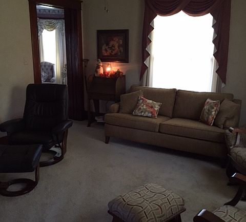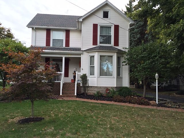 Well maintained two story home on main street. This home has 3 bedrooms with nice size closets, 2 full baths, open staircase ,den, living room, and dining room all with pocket doors. Wood cupboards, granite countertops, bricked floors along with brick backsplash and brick arch work in the kitchen. There is an additional small room which could be used as an office. Ceiling fans throughout the home. Beams in the kitchen and the den. The basement is finished with fireplace, laundry room, and storage room. Home also has a brick front porch and brick walkway. Large deck on the back of the home. There is a two car barn/garage with overhead doors. There is a full floor loft in the barn. An Amish built shed is also on the property. This home is completely landscaped. A whole house generator and a softener come with home. Appliances and window coverings are also included.
