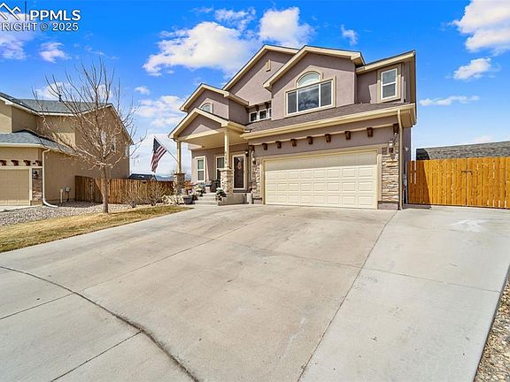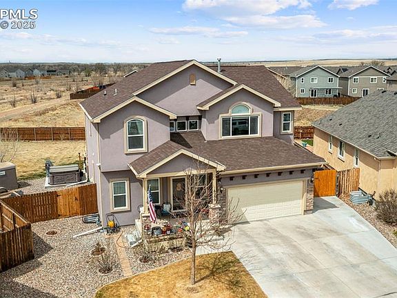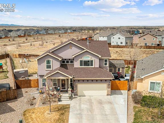Located in The Meadows at Lorson Ranch, this beautifully maintained two-story home with a fully finished basement offers space, comfort, and modern upgrades throughout. With 6 bedrooms, 4 bathrooms, and a 3-car tandem garage, there’s room for everyone. The main level features a spacious living room, eat-in kitchen, dining area, half bath, and a versatile formal dining room that can double as an office or flex space. The kitchen boasts granite countertops, ample cabinetry, pantry, GE Profile stainless steel appliances—including a double oven and upgraded gas cooktop and a double oven. Upstairs, the primary suite includes a private sitting area, walk-in closet, additional closet, and a luxurious 5-piece bath. Three additional bedrooms two with walk-in closets, a full bath with double vanity, and a conveniently located laundry room complete the upper level. New carpet has just been installed throughout the upstairs and staircase for a fresh, cozy feel. The fully finished basement adds a large family room, one spacious bedroom, a full bathroom, and an extra room built and permitted in 2020—perfect for guests, hobbies, or multi-generational living. Recent upgrades include new luxury vinyl plank flooring on the main level, marble countertops in secondary bathrooms, modern light fixtures, interior motion-detection lighting, garage loft shelving, insulated garage door with upgraded opener, whole house fan with keypad/remote, whole house humidifier, and a brand-new shed with a concrete pad. Situated on a .32-acre lot backing to open space and trails, the backyard features expanded patios, a garden shed, planned greenhouse, 220V outlets, fenced side yard for extra parking, and a gate in the back to the trails—all with stunning Pikes Peak views. Just minutes from Fort Carson, Schriever SFB, Peterson SFB, shopping, and dining, this home truly has it all!