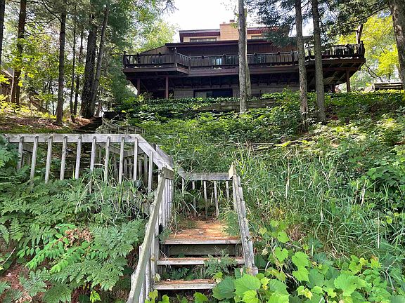 Stunning Forest Lake Waterfront Retreat-4BR,2BA-2 Docks, Walkout Basement. Nestled on two spacious waterfront lots offering 4 bedroom, 2 full bath with walk-in showers. The home is designed for both comfort and entertaining. Step into the great room with soaring vaulted ceilings, floor to ceiling stone fireplace and large windows that flood the space with natural light and frame serene lake views. The open concept layout flows seamlessly into a well appointed kitchen and dining area. Relax in the screened in patio or retreat to the walkout basement fully finished with a second stone fireplace. The loft area features charming built in beds ideal for extra sleeping space. The two car detached garage includes a finished bonus room above perfect for guests, a studio or an office space. The Association offers access to clubhouse, campground, playgrounds, beach , boat launch, pavilion, rifle river and is surrounded by state land .
