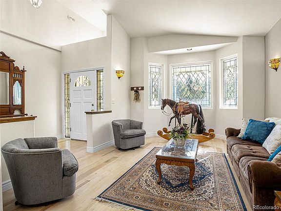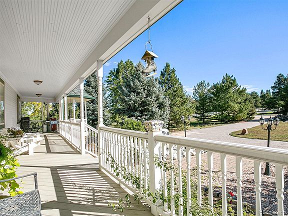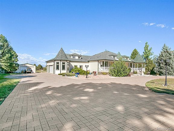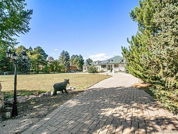 Sprawling ranch with full finished walk-out basement and spectacular mountain views. Four bedrooms, six baths, three car oversized garage, 30x60 outbuilding. Terrific kitchen with upgraded black stainless steel appliances including induction cook top, convection oven, second oven and warming drawer, Fisher Paykel two drawer dishwasher, microwave, Kitchenaid refrigerator, slab granite counters, breakfast bar, pantry, skylight and eating nook. Formal living and dining rooms plus a large vaulted family room with gas fireplace and windows boasting the mountain views. Laundry room, primary and secondary bedrooms with private baths and guest bath complete this level. Excellent multi-generational floor plan in the lower level with a recreation room, two bedrooms with en-suite baths, bonus room, guest bath and storage/utility room with sink. Circular front and side paver drives equipped to carry commercial load vehicles and oversized, drywalled side-load garage with built-in toolboxes, skylights and openers. Outbuilding has two 12 foot overhead doors, concrete floor, 150 AMP electric service and heat. Central AC and furnace are two years old, roof is three. Delightful no maintenance front porch spanning the entire length of the living space accented by matching turrets on both ends. True pride of ownership in this well maintained home. Enjoy mountain views, award winning Cherry Creek schools and walk to Regis High School. This one is a “must see”