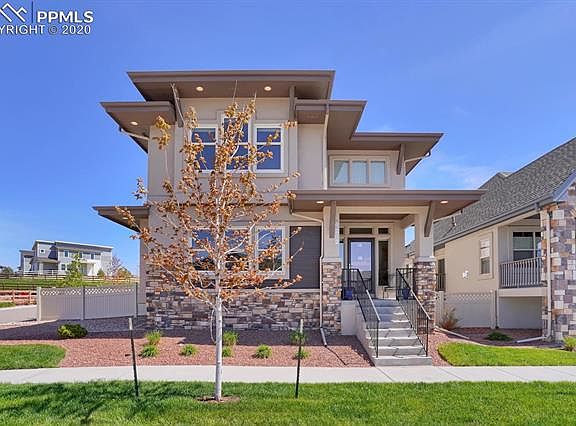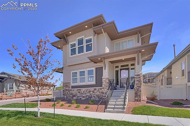This amazing low maintenance 2 story home has everything you could want! VIEWS! From the covered front porch, from the living room, from the master bedroom from the fenced in yard, from the master bathroom and from the upper deck! Situated on a corner lot with 4 bedrooms to include a junior suite, 4 bathrooms and an oversized 3 car garage you wont want to miss this tastefully appointed home. With 2 fireplaces, a wet bar, fenced in yard with vinyl fencing, hardwood floors throughout the main level this home has it all! From the time you pull up to the home you notice the views. Located on a corner lot with a covered front porch you enter into the home and notice all the natural light. The living room has a beautiful stone surround gas fireplace with a mantle and is open concept to the dining room and kitchen. The gourmet kitchen is a dream with stainless steel appliances to include a separate hood over the range and Fisher & Paykel 2 drawer dishwasher. The granite countertops, large island, pantry and beautiful cabinetry round out this kitchen. Walk out to a covered patio complete with a low maintenance vinyl fenced in yard with a full on Pikes Peak view. Built in gas line and extended concrete patio with no one next to or behind you make for a very private fun area to spend time. The main level laundry, the powder room and the oversized finished insulated 3 car garage with service entry into the yard finish the main level. The basement boasts another fireplace and a wet bar with beautiful granite top and a wine fridge. The bedroom in the basement is a junior suite with an attached bath. The upper level has 3 bedrooms to include the master retreat with stand alone tub against a stone accent wall. Wolf Ranch has a lake, parks, a clubhouse and a pool!
