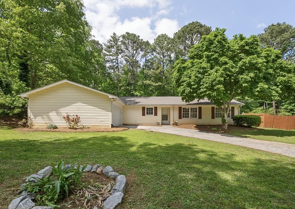 This Stone Mountain one-story home (no steps!) offers location, privacy and a great investment opportunity, with a two-car garage and a deep partially wooded half-acre lot. Choose your private back porch or backyard for morning coffee or evening wind-down. The peaceful backyard features a dog run, blueberry bushes and a view of trees along the back lot line. The half-acre lot is deep enough to add a garden, a pool, or to play ball. In 2022, the owner made substantial improvements. Carport is now a garage with utility room and a side door leading to the kitchen and laundry area. French drains and river rock direct water away from the house. New roof with transferable warranty, new water heater, new interior LVP, and renovated kitchen with new white cabinets, granite countertops and a breakfast bar! Since then, newer improvements include plumbing, electrical, a transferable termite bond, and new smoke/carbon monoxide alarms. Quiet neighborhood, close to schools and only 10 minutes from Stone Mountain Park, Stone Mountain Village, and Wade Walker Park and YMCA. Avoid freeway traffic by taking Rockbridge Rd. straight to Decatur or I-285.