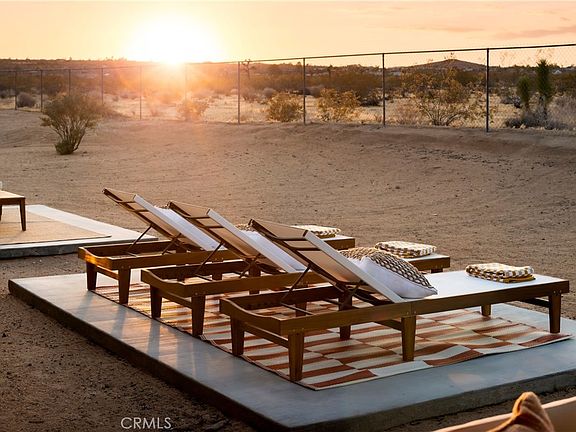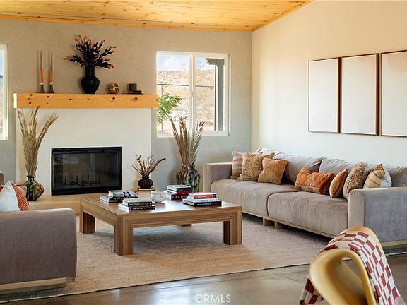 Golden Acres Getaway: Custom remodel and updating by Desert Dreams Home Designs – showcasing an incredible open floor plan, featuring a Great Room as its centerpiece with Venetian plaster walls for warmth and a fireplace for ambiance along with sublime mountain views of Joshua Tree National Park to the south. From there, wander into the incredibly spacious kitchen/dining room, with high-end appliances, quartz countertops, and an Italian Verona stove – carry your home-cooked meals out to the private covered patio out back, with yet more views of open desert and mountains in every direction for indoor/outdoor living/dining. 3-bedrooms and 3 bathrooms, spread over 2,000 square feet, is only the beginning. A large attached garage provides extra storage or parking, with a secret studio/office/extra bedroom off the garage. In addition, stands another freestanding, detached fully-permitted structure that could be converted into an ADU/Guesthouse or used for additional storage or as a large private studio or office away from the main house. Interior of home features vaulted ceilings finished with tongue & groove, lime wash accent walls, hand-wrought bathroom vanities, polished concrete floors and more. The grand primary suite features sliding glass doors to another back porch, further enhancing the indoor-outdoor experience and a large bathroom with custom hand-applied plaster throughout. All surfaces inside and out are newly painted or resurfaced. Nearly 2-Acres of land to roam and fenced for privacy and security for children and pets. Custom electric entry gate greets your arrival. Sure, you can Airbnb it, or just move right in and call it home! Desert Lifestyle living at its finest.