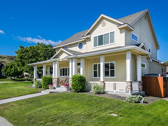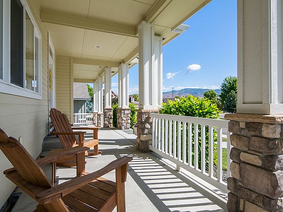 Enjoy summer nights on wrap around veranda. Hardwood floors in entry w/lighted art niches. Family sized kitchen w/solid surface counters, under cabinet lighting & updated backsplash. Double ovens, SS appliances & walk in pantry. Main level guest suite w/bathroom. Master Suite upstairs w/panoramic window for views of foothills. Tile floor in all baths, dual vanities in master w/Sep tub & shower. Large walk in closet w/direct access to laundry rm. Bonus rm upstairs w/built in desk. Oversized 3 car garage.