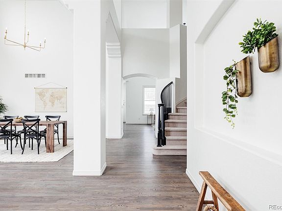 Classic composure comes to light in this Grant Ranch residence. A warm brick exterior invites entry further inside to an open floorplan flowing w/ newly refinished oak floors. An array of vast windows draws in ample natural light as fresh wall color and new light fixtures brighten the space further. Two-story ceilings command attention upward in a formal living room and dining area w/ seamless flow for entertaining. An eat-in kitchen beams w/ all-white cabinetry and newer stainless steel appliances. Nearby, a half bath is an added convenience. Vaulted ceilings craft an airy retreat in a primary suite w/ a fireplace, full bath and mountain views. Sizable secondary bedrooms are complemented by two ¾ baths. Downstairs, a finished basement flaunts a wet bar, two bedrooms and a full bath. Privacy abounds in an expansive, tranquil backyard surrounded by fencing. Residents enjoy an ideal location w/ proximity to schools and HOA amenities w/ a community lake, clubhouse, tennis courts and more.