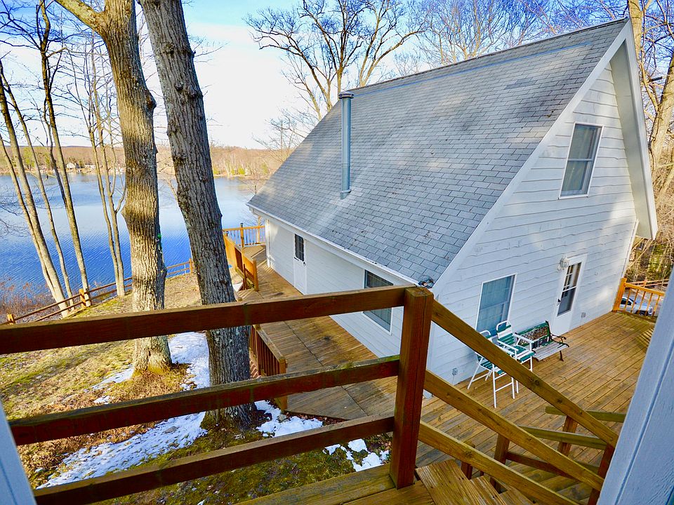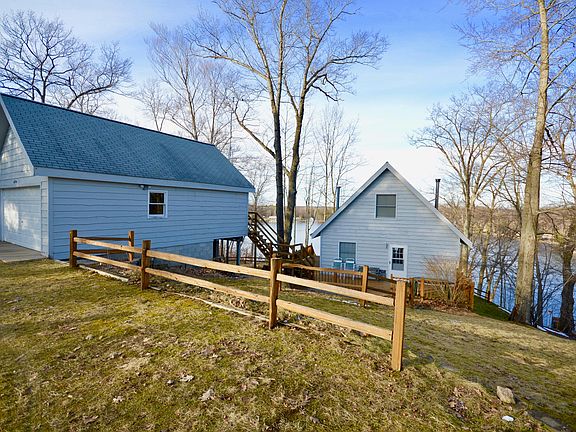 Tranquility Chalet...this wonderful year round home and cottage on Thunder Lake has been meticulously maintained and nicely updated. 3 bedrooms and 2 full baths w/room to sleep 8-10 adults. Wonderful year round views from atop the lake and plenty of birds and wildlife. Near Manistee National Forest & Ludington this cabin would be great for those that love to hunt, fish, swim, hike, ski, or just retreat. Well built with 2x6 side walls and Anderson windows. 2 stall garage w/ additional workshop &potential for finishing the attic. Plenty of indoor and outdoor areas to entertain and relax. With 1 bedroom on each floor enjoy some privacy as you rest. Walk out basement, soaker tub, appliances included. Furniture, furnishings, decor, and pontoon negotiable. Call to schedule your tour today!