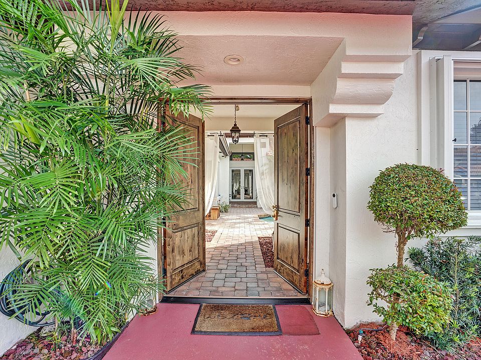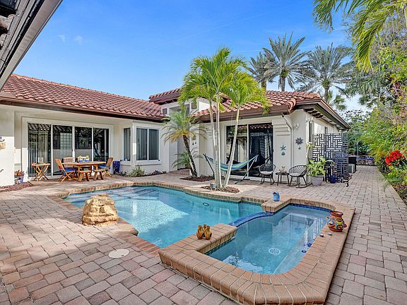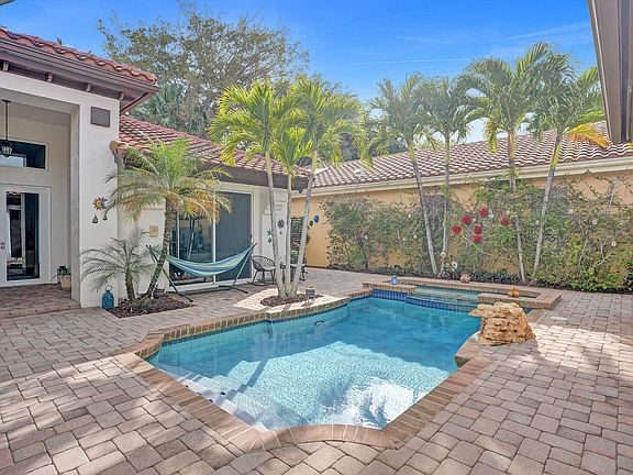 Welcome to your BEAUTIFUL COURTYARD HOME with private pool and spa in the upscale gated community of Santa Barbara. As you enter through the doors to the courtyard you will be transported to your own private resort complete with pool and spa. The Main House Features high ceilings with open living room and dining room. Main house has 2 bedrooms and third bedroom/den, 2 and a half baths. Spacious master bathroom features a double-sink vanity, walk-in shower, and a separate tub. The Separate Guest House located off the courtyard offers a private bedroom suite and full bathroom. Home features updated kitchen & bathrooms with updated tile flooring throughout main living area and engineered wood flooring in bedrooms. Newer appliances, accordion shutters and impact glass doors Wired alarm and audio system throughout. There are four security cameras three outside and one in the home included. Monitor via phone and night vision.
