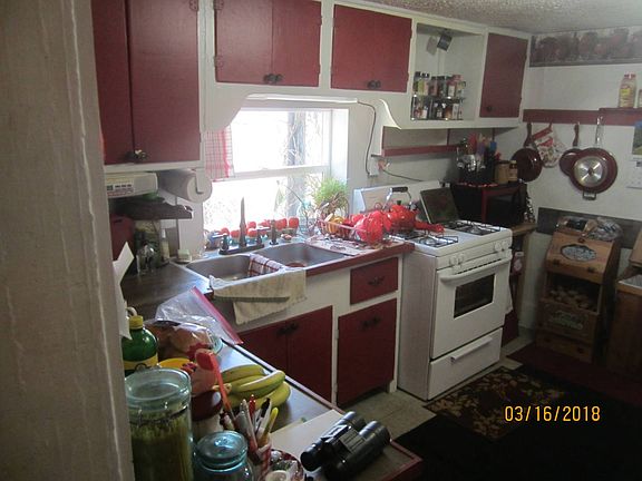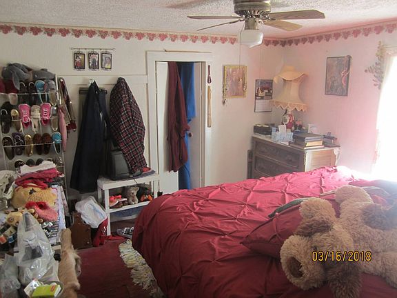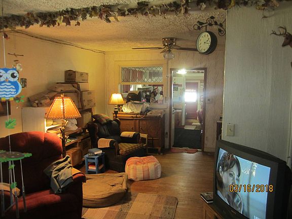 Living room combo dining room, 3-4 BRs, 1 bath, Kitchen, large utility room & enclosed front porch plus new south & east open porches. 20'X20' garage, numerous sheds & storage buildings. Lot for horses or good dirt for garden. Good water well, septic & owned propane tank. Trees for shade & shelter belt. Fenced chicken pen, chicken house & chickens.