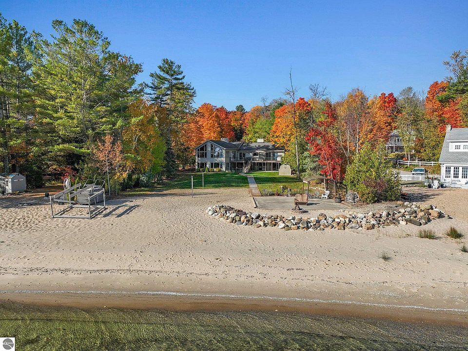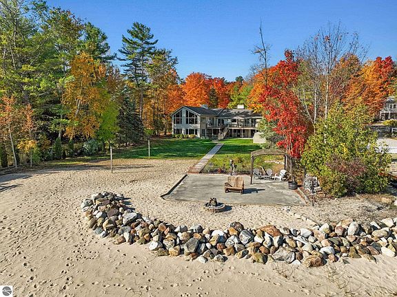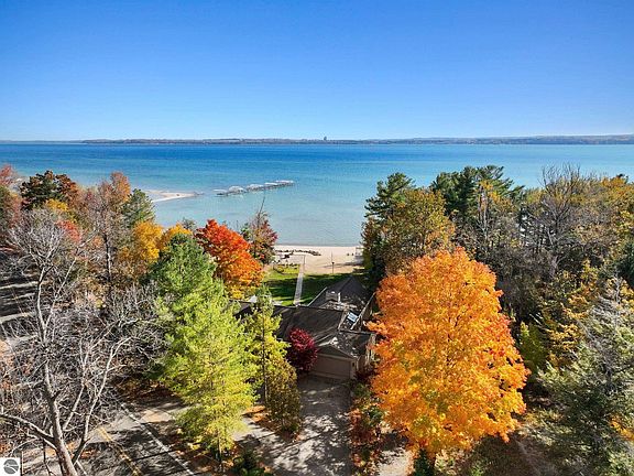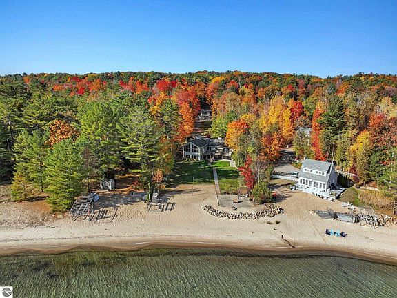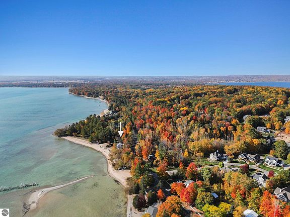 Searching for your dream waterfront retreat? Look no further! Featuring 99’ of coveted East Bay shoreline, this stunning property offers a rare sandy beach leading to a deep lot with lush green lawn. Nestled at the base of Old Mission Peninsula, its unrivaled natural beauty is matched only by its prime location just minutes from downtown Traverse City, schools, parks, & wineries. This home delivers the perfect blend of serenity & convenience. Once you arrive, you may never want to leave! Immediately you are greeted with panoramic water views that fill the open living area. Floor-to-ceiling windows, skylights, & a cozy gas fireplace create an inviting ambiance. The updated kitchen features an island, subway tile backsplash, herringbone plank flooring,& a walk-in pantry, all complemented by stunning views of the bay.The expansive deck extends your living space outdoors, leading to the lush green grass and sandy beach below.Truly an entertainer’s paradise.The main level also features a charming office with a gas fireplace, a convenient laundry room, & a lavish primary suite. Here, you’ll enjoy breathtaking bay views, deck access, & an updated en-suite bathroom, jetted shower, soaking tub, & a spacious walk-in closet.The lower level offers a versatile sunroom, additional spacious bedrooms, & a full bath. A unique rec room with a wet bar and fireplace is already plumbed for an additional 1/2 bath. The space also has direct access to the waterfront, making it ideal for an in-law suite. Outside, the landscaped grounds include a sprinkler system, volleyball court, garden area, concrete pad on the beach, & a storage shed, ensuring that the outdoor experience is just as exceptional as the interior. With meticulous attention to detail,updated trim throughout, & multiple living areas, this home embodies luxury, comfort, & unparalleled waterfront living. Don’t miss the rare opportunity to own your slice of paradise on East Grand Traverse Bay.