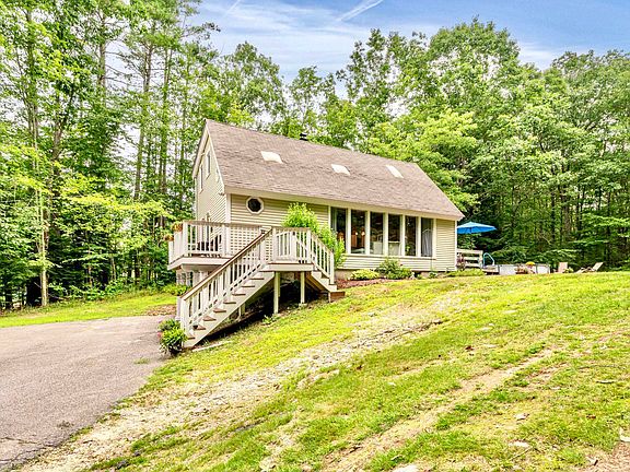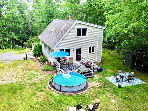 A GORGEOUS RINDGE OASIS, WELCOME HOME! Nestled on a tranquil and private lot, this 3BR/1.5BA contemporary cape offers a perfect blend of modern convenience and classic New England style. Step inside and notice the gorgeous updated luxury vinyl plank flooring that flows seamlessly through the open concept floor plan, with beautiful exposed beams, cathedral ceilings and massive casement windows allowing in for maximum natural light. The lovely living area is ideal for both entertaining and everyday living and a pellet stove adds warmth and character. Perfect for the budding chef, the gorgeous kitchen is equipped with excellent appliances, a huge kitchen island with built in cooktop and breakfast bar, and plenty of cabinet and counter space. Adjacent is the spacious dining area, perfect for family meals. Conveniently located off the living area is the 1st of three spacious bedrooms, as well as a half bath. Head upstairs to the exposed balcony overlooking the first floor, flooded with light from the skylights and natural hardwood flooring to find two additional large bedrooms and a full bathroom. There is a large unfinished basement, just begging to be finished for extra living space, with a convenient walkout. Outdoors, enjoy your picturesque property, providing a peaceful retreat, with a large deck, perfect for barbecues and gatherings, a fire-pit, above ground pool, gardening space, and so much privacy! DO NOT MISS THIS GEM! Open Houses SAT 8/3 & SUN 8/4 from 11-1pm!