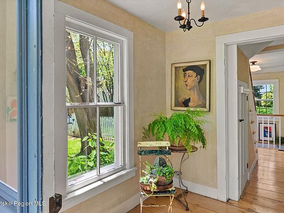 Known as the ''Jewel Box'', this charming 19th century eyebrow colonial has the perfect balance of country living in historic Kinderhook Village. Many original features inside this two bedroom, light filled house include wide board floors, 6 over 6 windows, beautiful venetian plastered walls with a soft iridescent finish and an early fireplace with cooking arm and beehive oven for baking. Enter from the classic front porch through the double doors to the foyer. The spacious living room opens into the dining room with space for a large dining table and an additional seating area. The kitchen has been beautifully renovated with new counters, tiled walls and appliances. The full bath on the first floor has a marble topped vanity and a classic claw foot tub, perfect for soaking or showering. Upstairs are two bedrooms, the primary with a vaulted ceiling and exposed beams. The second bedroom could also be used for workspace. Downstairs, the kitchen opens into a screened porch that is the full width of the house and perfect for summer evenings. On almost a half an acre, there are numerous gardens with perennial plantings of tulips, allium, roses, peonies, hostas along with a Japanese maple and crabapple trees that provide blooms and color from spring through fall. The fully fenced garden has a brick pathway and lovely mature trees, one with a romantic tree swing. A cute shed provides storage for garden tools and equipment. And there is enough room for a pool! Just steps from the Empire Trail for walking or a bike ride. Pick fruit and vegetables at Samascott Orchard or walk to their Garden Center for sandwiches, salads and homemade ice cream. Take a short stroll into historic Kinderhook Village for cafes, restaurants, the Farmer's Market on the Village Square, wine store, library, The School for art exhibits, galleries and the new bookstore. Guests can stay at the newly renovated Old Dutch Inn. An ideal location only 10 minutes to Chatham, 20 to Hudson for Amtrak, 30 to Albany and only 2.5 hours to NYC. **Open House--Sat, 5/17 & Sun, 5/18--11:30 am - 2:00 pm.**