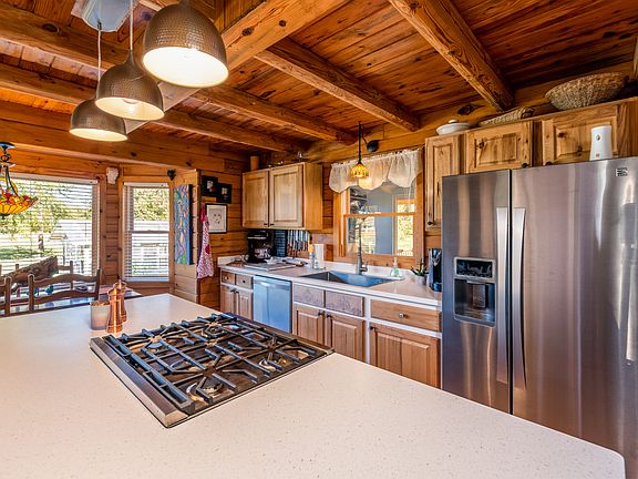 Wow! Log Cabin & 4.77 acres fronting Buffalo River, featuring a greenhouse, garden spot, fenced-in yard, 2 car carport & workshop! Log construction, wood walls, ceiling thru out. Living room anchored by vaulted wood ceiling, open to well appointed kitchen w/solid surface counters, large breakfast bar/ island, pantry, stainless appliances/ farm sink, bayed window dining area-adjacent to the den w/gas fireplace. 2 level open decks, covered front porch. Sitting area along water front! Call Anne 7315497531.