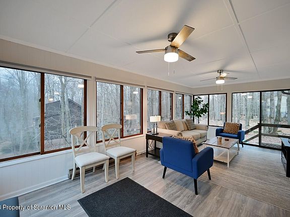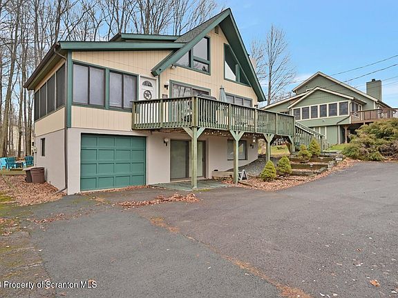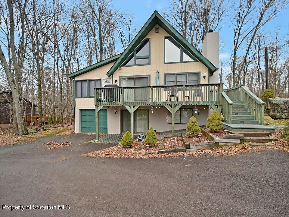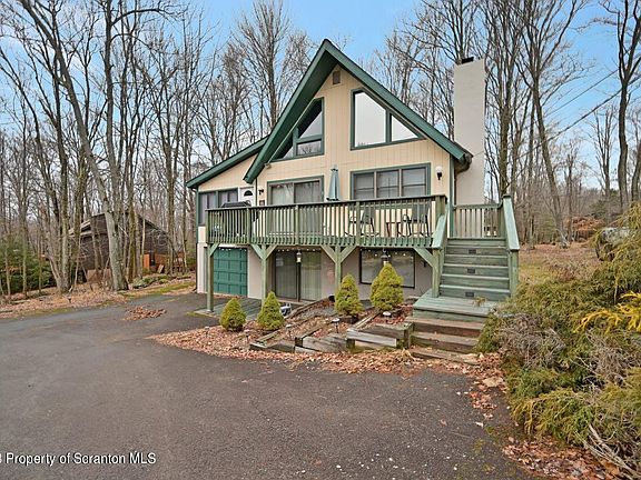 Welcome to the Evergreen Lodge! This beautiful Chalet is completely turnkey and located in the heart of the Poconos in the Hideout within walking distance to North Recreation area that includes a playground, heated pool and tennis courts. Community is filled with several amenities to include beaches, golf course, tennis courts, ski slopes just to name a few This spacious 3 bedrooms, 3 full bathrooms, 1 car garage home offers a bedroom and full bath on each level giving privacy to your guests. It has been newly remodeled to include fresh paint, flooring throughout, new light fixtures, just to name a few. Come up the staircase to a spacious deck that leads to an exquisite sunroom which is set up to enjoy all seasons from watching the flowers bloom to the snow fall. Walking into the main level that consist of an open concept kitchen, living/dining area, as well as a bedroom and full bath. Modern kitchen is equipped with new cabinets, stainless steel appliances, butcher block island, tongue and groove ceiling which you will also find in the dining area. The cozy living room has a wood burning fireplace for those chilly nights. On the second floor you will find the master bedroom with full bath and a loft area that overlooks the living room. In the lower level there is a family room, laundry room and another bedroom across from a full bath. The exterior of the home has a circular driveway that connects to a walkway that leads to the cleared back yard where you can relax around the fire pit., Baths: 1 Bath Lev 1,1 Bath Lev L,1 Bath Lev 2, Beds: 1 Bed 1st,1 Bed 2nd,Mstr 2nd,1 Bed LL, SqFt Fin - Main: 930.00, SqFt Fin - 3rd: 0.00, Tax Information: Available, Dining Area: Y, Sewer Comm Central: Y, SqFt Fin - 2nd: 378.00