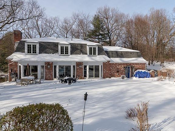 This charming and sophisticated European Colonial set on a private acre lot is bordered by a lovely brook .There are only 6 homes on this street.This imaginative home was custom built by Chapdelaine and is timeless in its decor and design. Large windows and sliders showcase the serene views from all rooms and complement the creative architecture. The bonus room was completed by the current owner and currently used as an exercise room with its own split heating air central system. The master suite adjoining the exercise room (bonus) was 2 bedrooms and can easily be converted back.Located near the center of town it is an easy commute to shops,schools and parks. A whole house generator has been installed and the flat roofs are newer .This lovingly kept home has special features such as large crown moldings,dining room wooden ceiling, built in bookshelves,a thoughtfully finished lower level with the same character as the two upper levels and two stairways to the interior and the garage.
