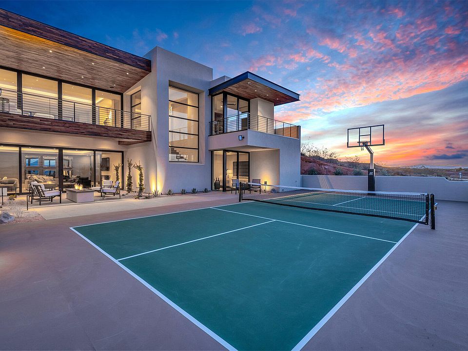 Saltwater pool and spaHague water systemC-channel steel beamsImported italian quartzite countertopsInduction cooktopLutron blindsFully equipped gym