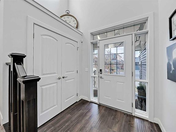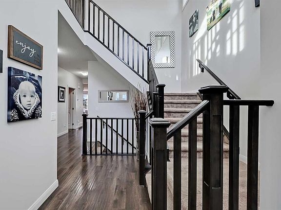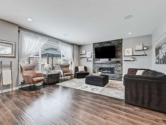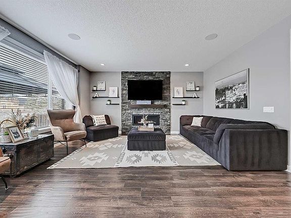 GORGEOUS ESTATE HOME | BACKING GREENSPACE & PATHWAY | OVERSIZED GARAGE | WALKABLE TO AMENITIES! Welcome to this beautifully cared for and extensively upgraded 4-bedroom home in one of Ravenwood's most connected locations. Here, you are literally steps from everything that makes the community special, including 2 schools just down the pathway behind the house, playgrounds, sports fields, outdoor rink, the pump track, pond and pathway system, Amphitheatre Park and the shops, services and restaurants at Kingsview Market and Yankee Valley Crossing. This family-friendly community also boasts quick access in and out of town via the 40 Avenue interchange on the QEII. Designed for comfortable family living, this home offers exceptionally thoughtful function and flow from the moment you step inside. A bright front entry opens to a private office with French doors, perfect for working from home. The open kitchen, dining and living areas form the heart of the property, featuring an upgraded kitchen with abundant full height cabinetry, stainless steel appliances including built-in oven and microwave, glass cooktop, large island, upgraded bulkhead lighting, walk-through pantry and a dining area that leads to the back deck. The living room is warm and inviting with its dramatic stone feature wall and generous natural light. The main level also offers a half bath and an enormous mudroom with custom built-ins that links directly to the oversized 21’5” x 22’11” attached garage and keeps daily life organized. The upper level offers an ideal layout with a bright vaulted bonus room highlighted by a full stone feature wall and a serene primary suite with expansive windows, walk-in closet and a spa-inspired 5-piece ensuite with dual sinks, relaxing oversized steam shower and soaker tub. Two additional large bedrooms, a full bathroom with a dual vanity and a dedicated laundry room with a sink complete this level. The builder-finished basement offers a large recreation area, custom bar perfect for hosting game nights or get togethers, a 4th bedroom, dedicated storage room and another full 4-piece bathroom. Outside, the backyard is a true extension of the home and living space featuring a large deck with a gazebo, mature trees and direct access to the green space and pathway behind. It’s the perfect setting for morning coffees, neighbourhood gatherings or simply relaxing and watching the kids play and enjoy the space. The long list of upgrades and additional features includes in-floor heating in the ensuite and basement bathrooms, dual zone furnace, central AC, Control4 home components, built-in speakers, 9’ ceilings, hand-scraped wide plank laminate, granite island & countertops, gas fireplace, newer fridge (water & ice), dishwasher and dryer, aggregate driveway, 18’10” x 15’5” composite deck with BBQ gas line, shed, pie lot and much more. Thoughtfully designed, beautifully maintained and set within a vibrant, family-focused community, this is Ravenswood living at its best.