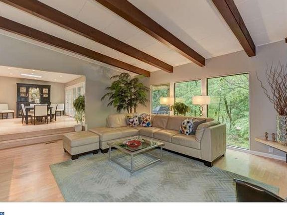 This home is a wonderful example of a complete renovation carried out with thoughtful planning, careful execution and an eye for beautiful d~cor and luxurious appointments. The bones of a standard mid-century ranch style home remain but have been transformed into a light filled open floor plan home that takes advantage of the cool green beauty of the partially wooded lot. The easy maintenance natural woodland landscape is cleverly combined with perennials and specimen shade plantings. Several outdoor living spaces have been created including a sunlit slate patio with bubbling fountain bringing that leads you to the entrance hall of the home. Indoors natural quarry tiles provide a wonderful contrast to the freshly painted dove grey walls. Step down into the dramatic great room with vaulted beamed ceiling, a wall of windows and a marble gas fireplace anchoring the far wall. The living room is open to the formal dining room with glass French doors opening to the expansive patio. The dining room is marvelous for entertaining being open to both the living room and kitchen. When you throw open those doors to capture the breeze the party will flow seamlessly inside and out. An arbor covers the patio which also features a chandelier! The kitchen renovation was remarkable. The cabinetry is beautiful with beautiful furniture molding and includes lighted glass display cabinets. Gleaming black granite countertops reflect the well-chosen task lighting. Speaking of entertaining, one wall of the kitchen is a sleek stainless steel full size refrigerator and full size freezer. The master bedroom is so serene with several large closets and glass doors to the private side patio with trellis and a second fountain. The master bath is luxurious with a glass enclosed shower and custom tile. A second master off the kitchen features the second full bath and a wall of windows overlooking the rear patio. The restoration of the bath updated the fixtures while leaving the beautiful vintage tiles in the walk in shower. On the other end of the home is a third main floor bedroom and tiled full bath. Downstairs the fourth bedroom is bright and sunny. A wall of closets and built in provide plenty of storage. Additional storage is located in the unfinished portion of the basement. All new windows (with the exception of the two fixed picture windows), new heat pump, brand new septic, new Mulehide Biteman roof and more updates have all been done for you. Welcome Home!