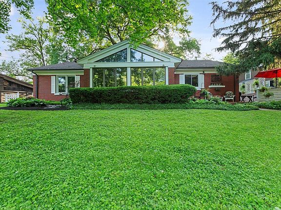 Est. 1952. Immerse yourself in mid-century design in this magnificent 1.5 story brick home in desirable Webster Park! With 5 bedrooms, 3 full baths & open floor plan, this home is perfect for daily living & entertaining. Enjoy stunning views & natural light through large picture windows, hdwd floors & a show-stopping floor-to-ceiling stone fp, embodying classic MCM style. The kitchen features maple cabinets, hexagon ceramic tile & ss appliances. Spacious main level primary bdrm offers louvered shutters & double closets, w/ original tile in the primary bath. Upstairs find 2 additonal bdrms, another full bath & versatile living space w/skylights. The basement includes a sauna & plenty of space for your future plans. Vinyl windows, new lighting & ample storage throughout. All of this on a .61-acre lot w/ a brick patio, luscious landscaping, a garden, & quaint bridge over a creek. 2 car attached garage. You won't want to miss this peaceful oasis in the heart of Webster Groves!