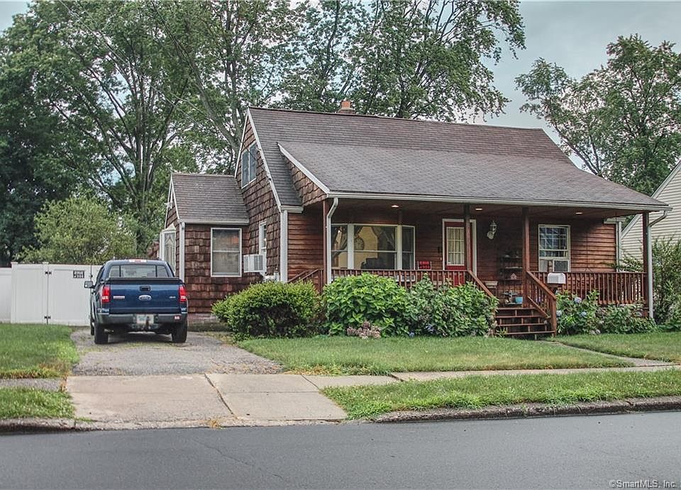 Expanded & Dormered 4 bed, 2 full bath cape with large deck and fenced in yard. Low traffic road. Enjoy morning coffee on the covered front porch. HUGE shed with upper loft - so much potential. Main level 2 beds, kitchen, living room, full bath. 2nd FL 2 beds, full bath. Partially finished basement. New water heater, new oil tank. Great potential in a desirable neighborhood.