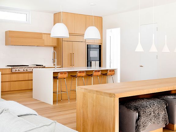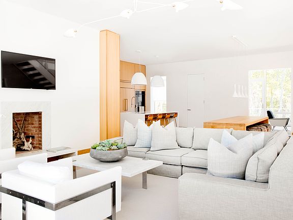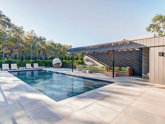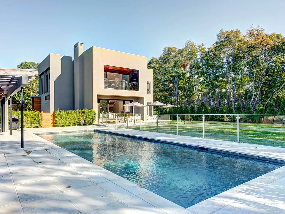 Every detail of this stunning home has been thoughtfully designed to offer a luxurious and peaceful escape in the heart of the Hamptons. Located just minutes from the charming Sag Harbor Village and Bridgehampton, the property is perched on a rise, providing rare, lovely water vistas of Noyac Bay from its rooftop living platform. This five-bedroom, five-and-a-half-bathroom masterpiece is tailored for pure enjoyment, relaxation, and indulgence. An open and airy floor plan greets you with soaring ceilings and walls of glass, filling every room with natural light and connecting you to the serene outdoor surroundings. Throughout the home, sophistication meets modernism with custom-made lighting, furnishings, and impeccable finishes. At the heart of the home lies the epicurean kitchen, featuring custom cabinetry, elegant white Caesarstone countertops, a marble backsplash, and state-of-the-art Miele and Wolf appliances, ideal for both intimate gatherings and culinary adventures.The home features four meticulously curated en-suite bedrooms, including a first-floor junior suite and a stunning second-floor primary suite that opens onto a private deck overlooking the picturesque property. The lower level is a world of its own, boasting radiant heated floors, a versatile secondary living area complete with a wet bar, a home gym, and a fifth private bedroom with a full bath. When it's time to unwind, the comfortable and inviting movie theater room promises endless entertainment, rain or shine.Step outside to discover your private oasis. The expansive lawn sets the stage for outdoor enjoyment, while a pristine 15 x 45' heated Gunite saline pool, a covered pavilion, and a pool cabana with its own bathroom await your every indulgence. Evening sunsets are best enjoyed from the rooftop living area, where the sound system enhances your favorite playlist. For ultimate relaxation, sink into the hot tub or bask in the warmth of the sauna, day or night.This one-of-a-kind vacation home offers every modern amenity, from Smart TVs in all the bedrooms to a Tesla charger in the garage. Ideally located near the best bay and ocean beaches the Hamptons have to offer, and with easy access to nearby villages, this property is truly a dream destination. A beautiful, unforgettable vacation awaits you at this modern masterpiece.