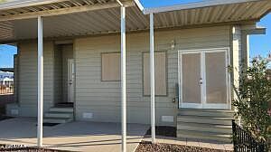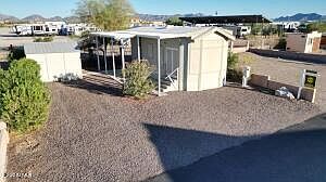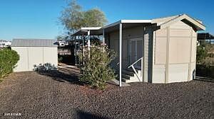 Beautiful 2016 Schultz Park Model, one bedroom, one bath, in Quartzsite's only gated community. This newer model has 9' Ceilings, Double doors, New 2 Zone Mini Split Heat Pump/AC, Insulated storage shed with washer and dryer, covered patio with concrete, and automatic water system. An additional RV hookup is ready for your trailer or RV. This is one of the nicest Park Models you will ever see. Full size appliance's, Microwave, Stove/Oven and Refrigerator. City Water and sewer (included in the low HOA fees). Don't miss this one! It won't last long!