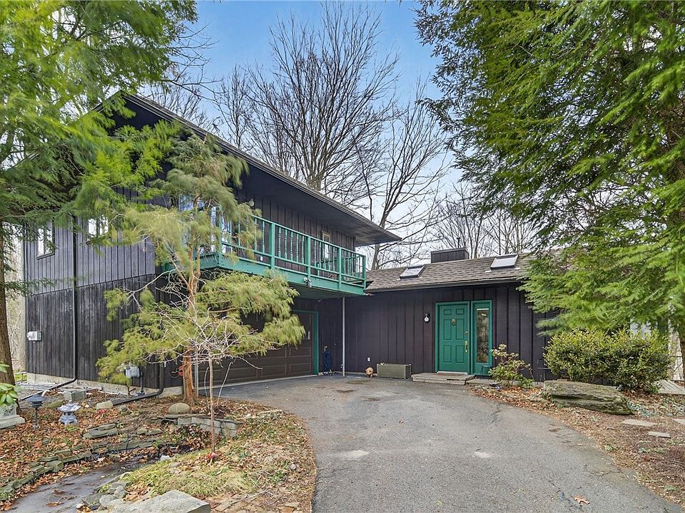 Nestled amidst the woods and a serene creek, this mid-century modern two-story home features 4 spacious bedrooms and two and a half bathrooms. Filled with natural light, it offers hardwood floors throughout. The spacious eat-in kitchen is perfect for entertaining and opens to the living room and main level balcony. The upper level with kitchenette is ideal for an in-law suite or guest space. With its treehouse-like charm, the house includes numerous balconies which provide beautiful views of the surrounding woods and creek below. The main floor bathroom showcases a vibrant, eclectic style, and the three bedrooms and large cedar closets on the lower level offer ample space. Set back from the road and with no windows facing the front, it creates privacy and a peaceful woodsy retreat. Its great location near the Jim Schug public trail enhances its appeal, while its proximity to Ithaca, Cornell University and Cortland adds convenience. Dryden Schools and located in the town of Dryden.