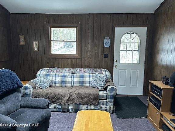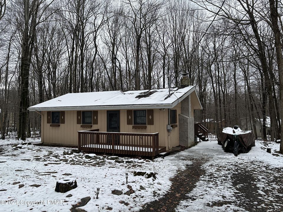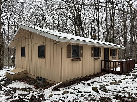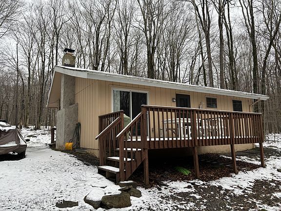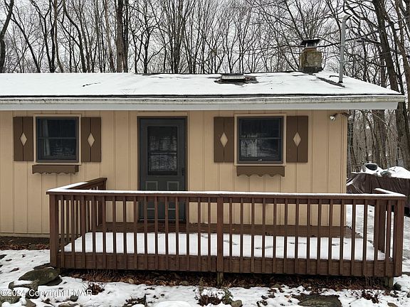 COZY CABIN - NEAR THE POOL!: This cozy 3 bed/1 bath cabin-style Big Bass Lake house is only a little over a 1/4 mile from the OUTDOOR POOL (less than 1/2 kilometer)!! This compact house features a real stone wood burning fireplace, Anderson windows (2 installed in 2015 & the majority in March 2019), front & rear decks, & a SHORT DISTANCE TO THE POOL! Like all homes in this private HOA, buy this small but affordable home & gain access to all the amenities of Big Bass Lake! In addition to the Outdoor Pool/Clubhouse, enjoy the Indoor Pool/Winter Clubhouse , gated 24/7 security, 2 beaches, 3 lakes with boat launch points, fishing, & more. About a 1/2 hour of major Pocono attractions including casinos, skiing, restaurants, shopping, state parks, & more. Taxes/measurements are approximate.