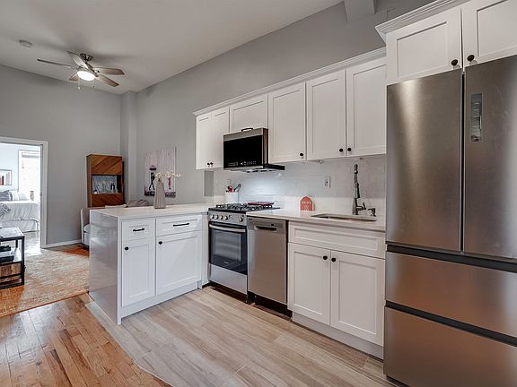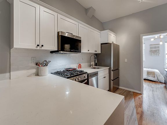 The updated open-style kitchen, featuring quartz countertops and brand new stainless steel appliances with warranty, leads to a spacious living area with 17 foot ceilings, providing ample overhead storage. Washer/dryer available both in the unit and in the building for convenience. Partial skyline view from the bedroom and the unit features deeded roof rights! Maintenance fee includes heat & hot water. Downtown access to path and busses and Hoboken’s Southwest Park is just around the corner. Pet-friendly!