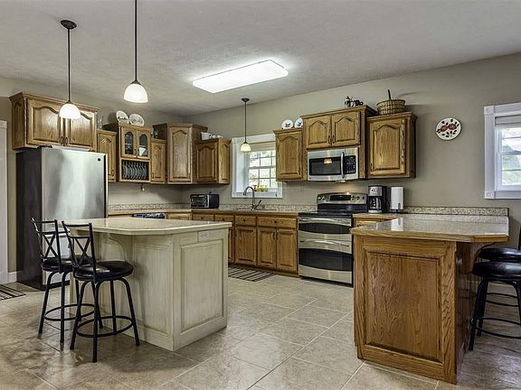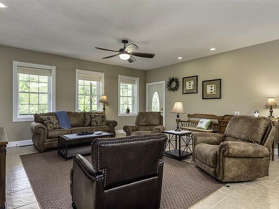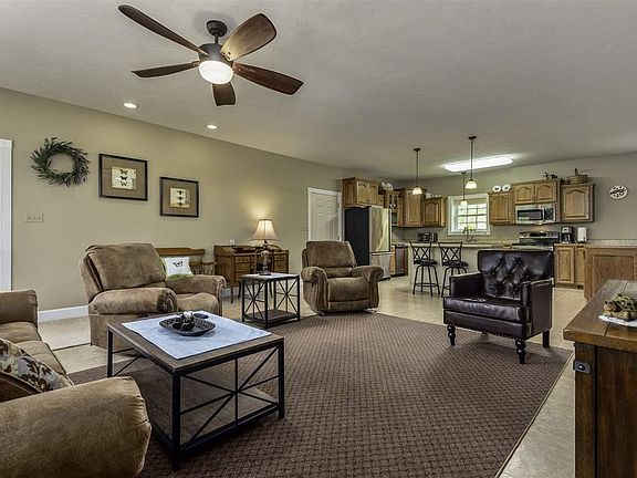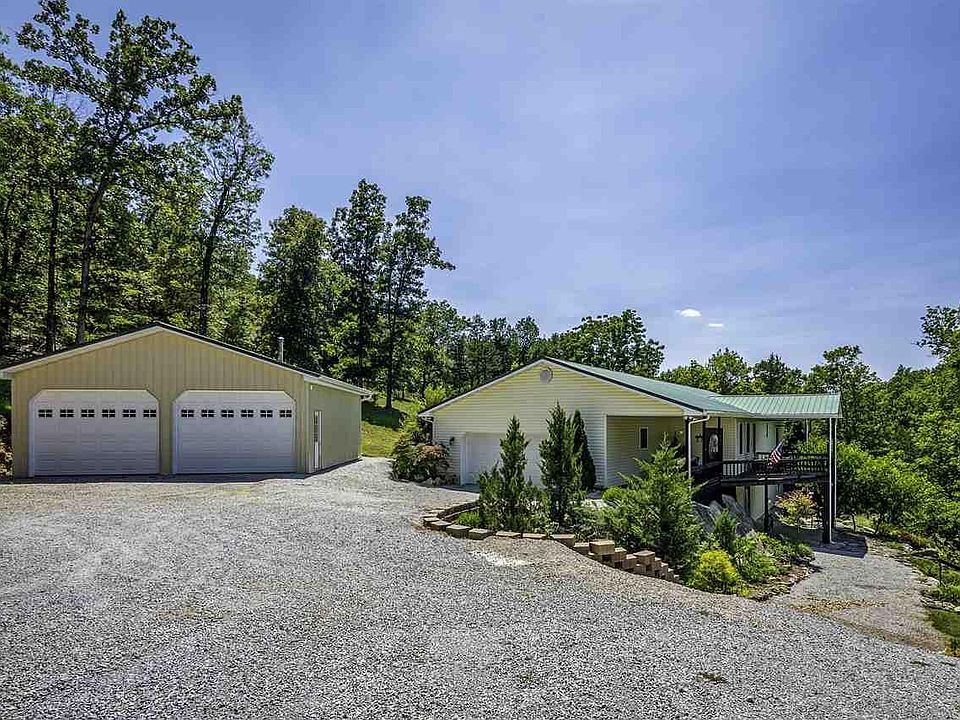 Private location nestled in the woods on 11.33 acres m/l w/spring fed stream creek. Relax, listen & view the wildlife plus stream from 2 covered porch areas of your low maintenance 3 BR, 3 BA home. Enjoy the popular spacious open floor plan with easy to clean tile flooring. Low energy costs from the insulated concrete form system(ICF). Lower level offers a rec/family room, BR & BA plus unfinished area for storage & crafts. A 28x30 detached shop/garage is foam insulated w/electric and wood stove.