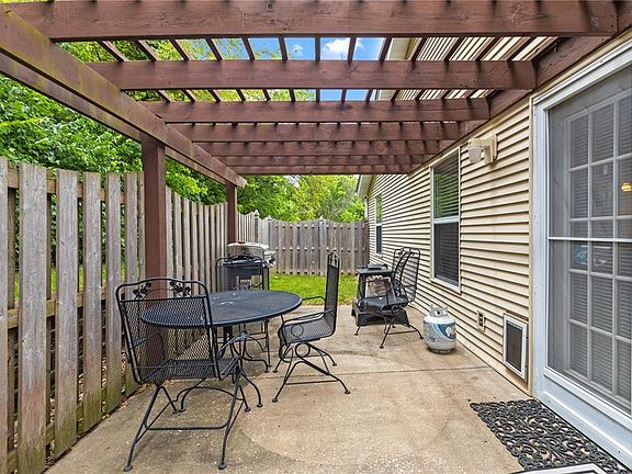You'll love the NEW flooring in this all one level beautiful 3 bedroom/2 bath villa with tons of upgrades throughout. End unit, so privacy abounds. The large kitchen was remodeled by previous owner with custom cabinets, soft-close drawers and sprawling Corian counterspace with breakfast bar, new microwave 2023, dishwasher, refrig 2020, stone backsplash, pantry, large dining area with newly accented wall. New Luxury waterproof vinyl plank installed late 2024, whole home recently paint. Large living room with french doors out to private 6 ft fenced patio. lovely pergola, grassy area and flanked by trees. Primary bedroom has 2 closets, luxury bath with tub shower separate, updated lights. 2 more bedrooms and full bath finish out, with laundry right outside master bdrm. Assoc fees cover pool, water, trash, some insurance, snow removal, lawn care, exterior maintenance. O/S 1 garage with extra storage. Very easy access to I-364 and I-70. Close to restaurants and shopping. Updated plumbing in laundry area in last year also. You will want to call this one home!