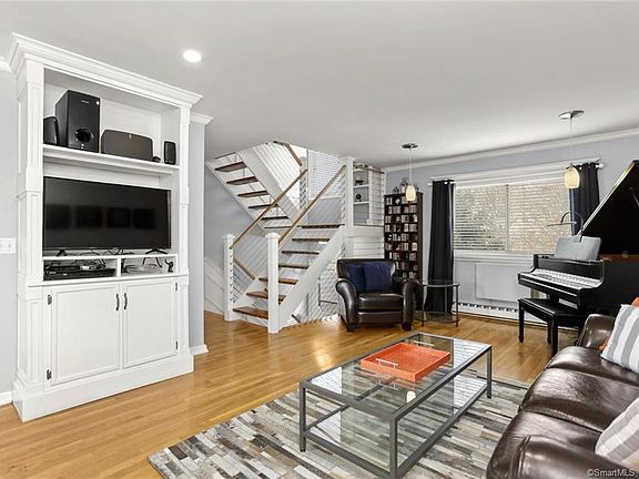 Once in a while a condo wows you the moment you step foot inside. This is one of those times. Upon entering, you'll be greeted by a welcoming foyer and a gorgeous, modern designer stair railing. The journey continues in the Living Room with polished hardwood floors, exquisite built-ins and seamless moldings. Entertaining or relaxing is easy to do in this inviting and comfortable space. The Dining Area leads out to light and bright balcony. The Kitchen with granite tile counters and stainless steel appliances, make cooking a pleasure. A renovated, half bath completes the main living area. With the gorgeous stair railings as your guide, the staircase leads to two spacious bedrooms, another beautifully renovated full bath and plenty of closet space. The finished lower level can be used as an office or family room. A light grey neutral paint color is easy on the eyes and gives the condo a clean, modern look. An attached garage makes coming and going a breeze. And on warm, summer days, a beautiful pool will keep you cool. With shopping, Home Depot, I-95 and Metro North just steps away, all you need is right at your fingertips. A block away from the Greenwich border. Put this on your must see list. Just unpack and move right in!