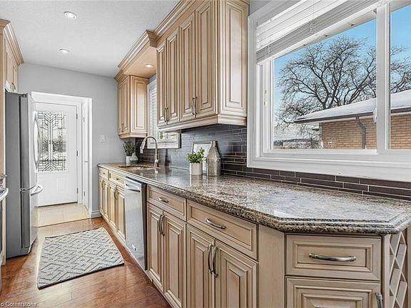 Welcome to this beautifully renovated brick bungalow in Hamilton’s desirable East End, directly across from a peaceful park. With over $120,000 in updates, this home seamlessly blends modern upgrades with classic charm, offering a spacious and functional layout ideal for families or multi-generational living. Step inside to discover hardwood floors and pot lights throughout the main living areas, creating a warm and inviting living space. The maple kitchen features mitre-sawn doors, granite countertops, and stylish finishes. The main floor boasts three bedrooms, a bright, functional living space, and a lovely full bathroom. The fully finished lower level offers a separate side entrance, making it perfect for an in-law suite. The basement includes two additional bedrooms, a living room, an updated kitchen, and a renovated bathroom—ideal for extended family or rental potential. Outside, enjoy the updated aluminum roof with a lifetime warranty, updated windows, doors, and trim, and composite panels surrounding the home. The long concrete driveway (75’ x 18’) accommodates 6–8 vehicles, leading to a large 24’ x 14’ garage and a covered porch perfect for relaxing. The backyard offers privacy and lots of sunlight. This meticulously maintained home is move-in ready and located in a vibrant, friendly neighbourhood with easy access to malls, grocery stores, shops, schools, highways, and public transportation. This exceptional East End property wont last, book your private showing today!