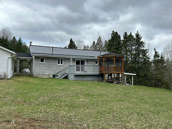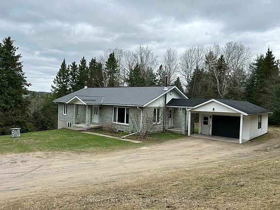 First time on the market: This 2 +1 bedroom brick bungalow with detached garage is situated on 9 plus acres, fronting on a paved township road close to lakes and river with privacy galore. This home features 2 bedrooms on the main level with a large primary bedroom with open concept kitchen dining room, with 4 piece bath on main floor with main floor laundry as well. Lower level sports a large family room with patio door to back yard, wood stove for those chilly evenings or cold winter nights. There is also a third bedroom and three piece bath on the lower level on the lower level as well. The yard is manicured and well maintained, new steel roof on the house recently. This is a must see property, you will not be disappointed. Book your showing now!
