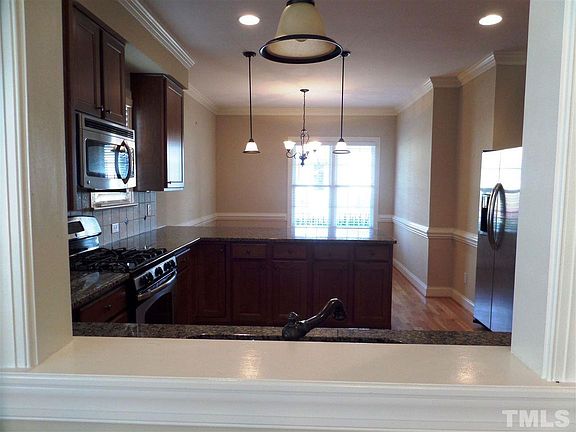 Brick Patio/Townhome in the #1 Town! Hardwood floors downstairs, open plan with loads of lite/builtins. Granite counters & bar dining along with breakfast & formal dining. Open to Fam. w/ gas log FP. DownStairs Master with lovely granite spa with tile shower, dual vanity,& WI closet. Upstairs are 3 large bedrooms & loft area. along with walk out storage & a pull down. Front porch & Screen porch/deck to entertain. Close to pool, walking trail & park. Walk to historic downtown Apex.Low dues too