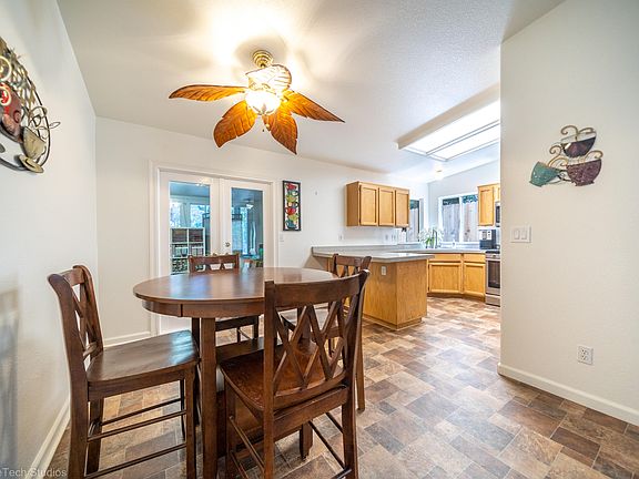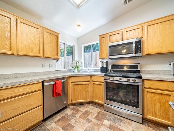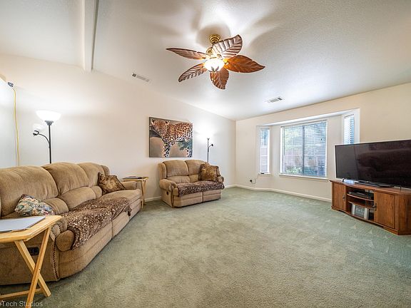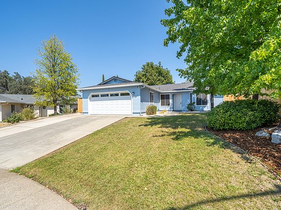 Updated home on cul-de-sac with newer roof, 14 SEER HVAC system, water heater, kitchen counters, sink and disposal, Whirlpool appliances, south fence plus fresh paint inside and out. Also includes 200+ sq ft sunroom used for crafts but could be great recreation room or family room with sink and cabinets plus has new roof coating may of 2022. Cathedral ceilings in living room kitchen and dining area. Indoor laundry room. Master has spacious walk-in closet with organizers. Home is not in high, very high or wildland fire zone. Large RV parking area with portable awning. Fenced dog run too. Washer and dryer stay.