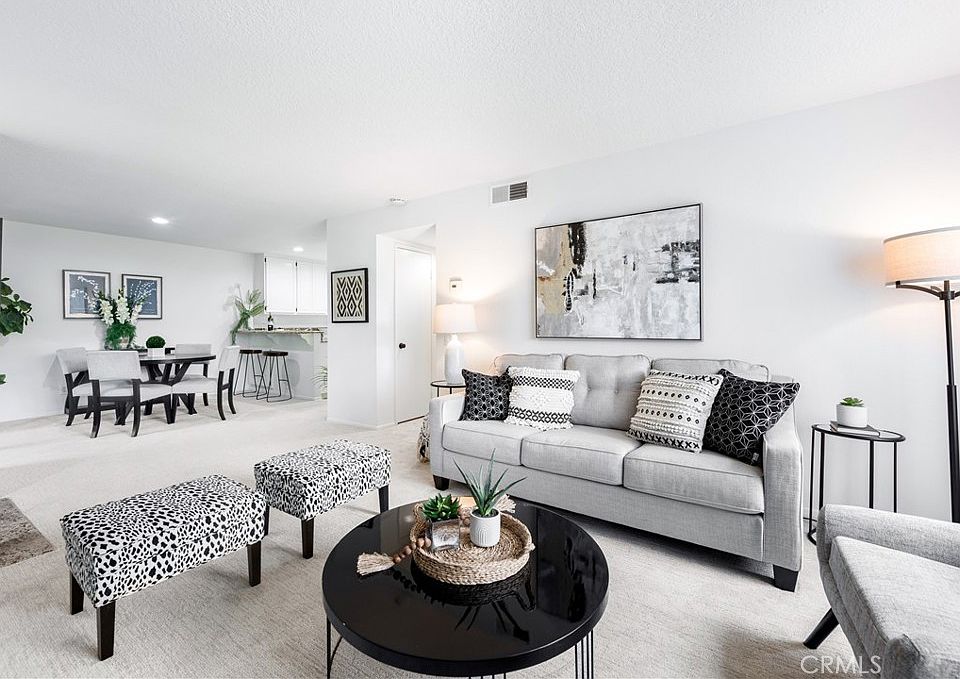 features a great floor plan, new carpeting in a soothing light neutral tone, freshly