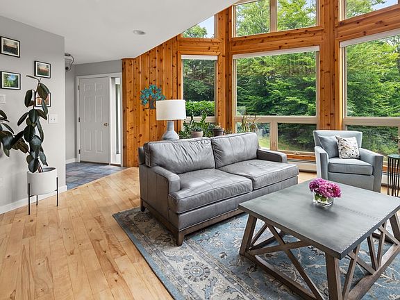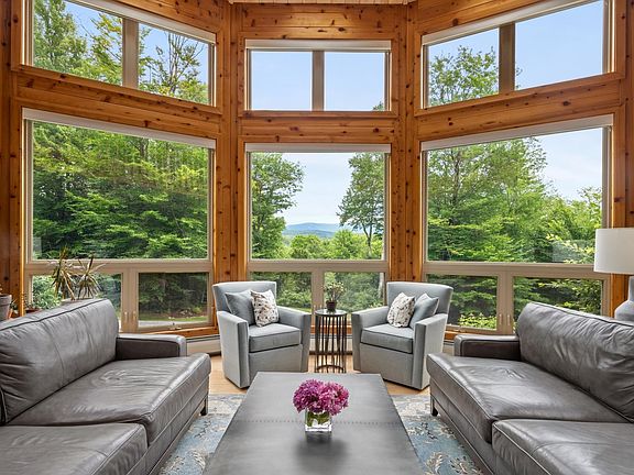 Contemporary Vermont retreat with spectacular views of Mount Mansfield and 11 acres to hike and explore. Well-appointed home that combines high-end finishes inside with beautiful natural vistas & land outside. Open concept living area with giant wall of windows enhanced by cathedral ceiling, hardwood floors & wood stove. Kitchen open to dining area and 1/2 bath complete 1st floor. Loads of room for family and friends with 2 primary suites on separate floors plus another bedroom with its own bath. 2nd floor primary suite completely updated with 2 walk-in closets, dressing room, oversized shower, laundry rm & space to relax. Large loft with space for an office or two. Lower level recreation space offers loads of natural light, more, views and a new 3/4 tiled bath. Plus a cozy tv rm to chill in. Property also boasts a heated 28x30' barn for hobbies, wood shop or possible RV or boat storage. Trex deck facing private woods & fencing for dogs. Enjoy more views of extensive landscaping and terraced gardens from quiet screened porch overlooking a pond. Details are done: a bath on all 3 levels, 5 minisplits to keep cool, easy to use motorized blinds, improved electrical and plumbing systems, newly installed french drain. Take a cleared wooded trail to some hiking trails. Enjoy privacy and natural beauty of this move-in ready home with added convenience of living within walking distance to Jericho Market, few miles to library and school.