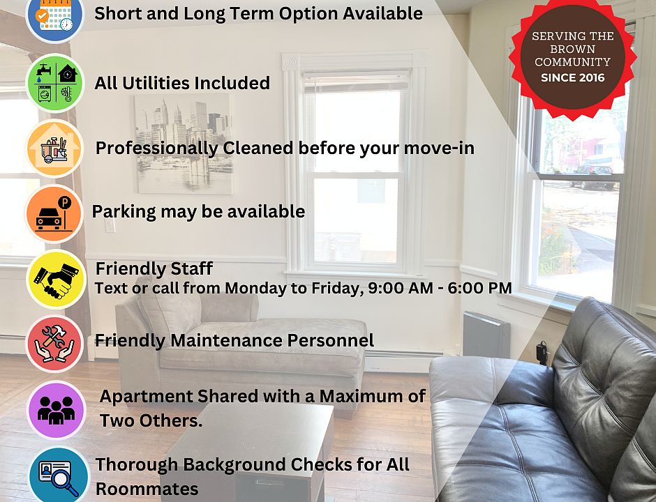 Private bedroom in a 4 bedroom 2 bathroom apartment, shared with usually Brown Graduate students, clean, quiet and neat. Note this apartment is shared, but the bedroom is private. Clean and quiet, hardwood floors throughout, dishwasher in kitchen, parking in rear included right outside the back door, easy in and easy out. All utilities included and WiFi included also. Walk to Brown, RISD, and the best food and drink on the east side! From gourmet burgers, to tacos, to Thai, to home made Italian pastas and pizzas, to craft cocktails, to vegan ice cream, and so much more walking distance to this apartment. Also you are a few minutes walk to 2 grocery stores, Whole Foods Market and East Side Market, as well as the Boston Sports Club, a great club with showers and sauna and towel service. You can also walk to India Point Park, a fantastic park with lots of festivals and music in the summer, and walk to the boat launch, launch your canoe or row boat, or run along to bike trail and head into the woods. Walk in the other direction and your in downtown Providence in 15 minutes to see Waterfire! Best neighborhood and a super private and quiet apartment. 12-month lease. All utilities included. Wi-Fi included
