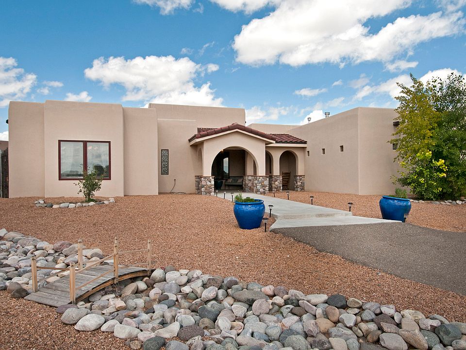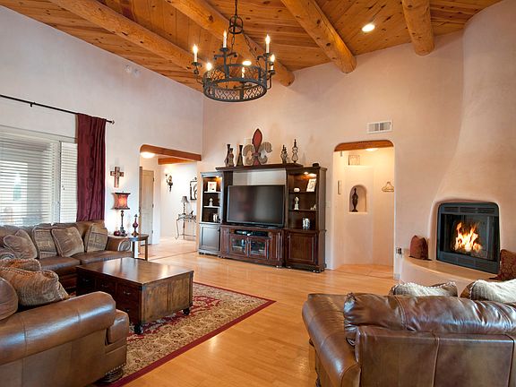 This is an elegant designer-inspired Spanish styled home located within the gated community of Las Lagunitas. Beautiful hardwood floors, plaster walls, stylish ceiling treatments, well appointed gourmet kitchen, and lots of natural light abound in this 2475 sq. ft. Santa Fe home. There is an optional 4th bedroom that would be a perfect studio or in-home office with its private entrance. Gorgeous Sangre mountain views from the picturesque dining area, the master suite is divine with a dual sided fireplace, and rear portal has a fireplace for outdoor entertaining. With handsome curb appeal, this home exudes fine quality and attention to detail that is uncommon at this price.