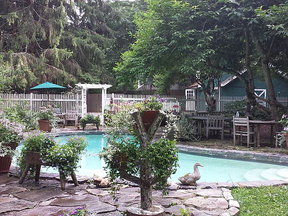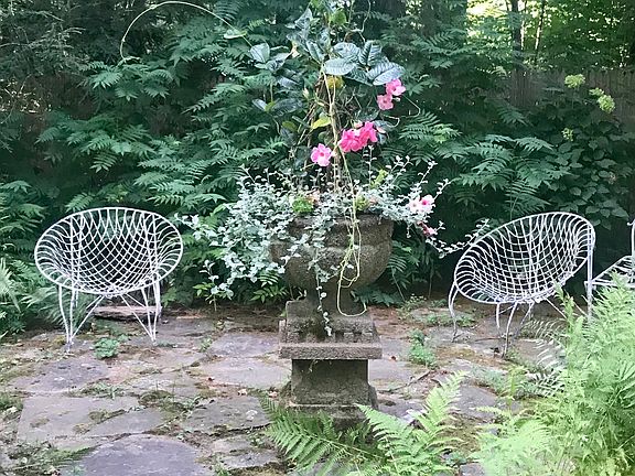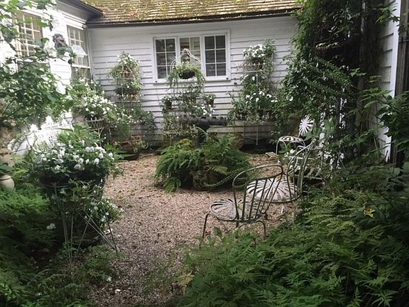 Visitors to this historic house often call it an "enchanted cottage" because of its warmth, coziness, charm and beauty. In the 19th century when there were many dams on the river, it was the miller's house for one of them. A large millstone from the dam rests by the ancient maple by the house. Its past dates from the American Revolution. It was rebuilt around 1860 after a fire wreaked considerable damage. The exposed beams show severe charring in several places, and bricks from the old chimney were found where the hosta bed sits. The president of the first Irish Republic possibly hid out in the attic from the British who had put a price on his head. Local lore has it that Ethan Allen was married in front of the fireplace. The center of the living room is its fireplace with a notable Ben Franklin stove which thrusts its warmth into the room. A duplicate of this beautiful yet utilitarian object can be viewed in the Smithsonian Institution. A modern element in the dining room are the murals of floating pears and clouds against a blue background painted on the cathedral ceiling by the notable artist, Carol Anthony. Guests find it reminiscent of Rene Magritte. The goal of the current owner was to bring the gardens inside by making a garden view available from every window. Doors were added to give easy access. It was on the original Garden Conservancy tour of gardens for over ten years. Its uniqueness won it a place in the archives of the Garden Club of American in the Library of Congress. The garden has become self-sustaining to a large degree and has been the site of the annual fundraiser the Tea for Two Hundred, or the Tea for Two Thousand as it's locally known. Over 6,000 people attended the event over its 20 year span and a million dollars was netted for charities. The house was the cover story for House Beautiful and the Connecticut Magazine. It has also been featured in Martha Stewart's Living(twice), The World of Interiors (twice), Country Living, Vogue and others. The house appears in the book, At Home with Books. In short, this is a fascinating house with a lively past. If only its walls could talk.Call for an appointment today! Agent/Owner