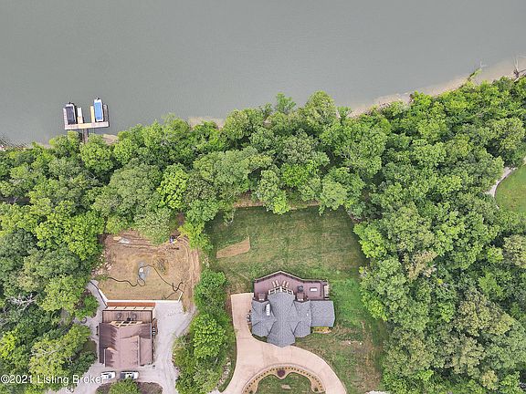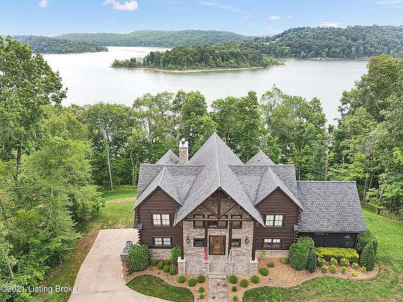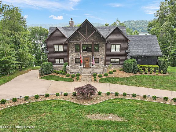 You'll love this stunning waterfront Nolin Lake retreat in gated Nolin River Run. The circle driveway has plenty of room for your guests. The covered front porch and inviting foyer welcome your guests. Enjoy entertaining? This one is an entertainers dream with the open floor plan and two story great room with a wall of windows to take in the lake views. The floor to ceiling stone faced fireplace has gas logs and is perfect for taking the chill off on those brisk evenings. Tucked in the corner of the great room is a bar that has a sink, granite counter tops, a beverage center, ice maker and room for bar stools. Get your apron ready as you'll love to cook in the gourmet kitchen which has a gas range, copper range hood, center island work space, tiled back splash, granite counter tops,