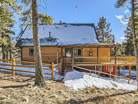 Gorgeous mountain living with a custom upgraded home on 1.01 acres. Excellent condition with a gleaming red-wood deck and strip lighting for evening entertainment. Gorgeous views to the southwest shows mountain vistas and can be seen from the deck, enclosed porch, and from the upstairs loft. The tall vaulted ceiling has been exquisitely finished with tongue and groove pine. The living-room, den, and all bedrooms have waterproof plank flooring. On the upper level is a small loft. The master bedroom on the upper level has a vaulted ceiling, incredible views and his and hers closets. Be sure to check out the view from the master bedroom. The main living room enjoys a gas double sided fireplace and in the tiled sunroom, a wood burning stove keeps one cosy in winter. Ideal space for exercising or enjoying your morning breakfast in this sunny room. Stainless Steel Appliances in kitchen were purchased in 2018. The lovely carpeted stairs lead you down into a den which has TV hook ups on two walls making this an ideal media room or office. This room has direct access to the garage and an outside door into the back yard. To the left is another sun-filled room ideal as a studio or workshop. The mechanical room on the basement level has a 1000 gallon cistern with new pump as back up, a rough-in for a future half bath, Well Mate water system pressure tank and a Rennai on-demand hot water heater. Sceptic tank was pumped in August 2023. This house was constructed with a quality insulated concrete foundation & slab and has a split rail fence in the backyard. Your pet can roam the backyard and cross to the front deck. Ideal location with walking distance to Mueller State park, 15 minutes to Divide, 30 minutes to Woodland Park, 20 minutes to Cripple Creek. The neighboring lot/0.54 acres is available to create a total 1.55 acre parcel.