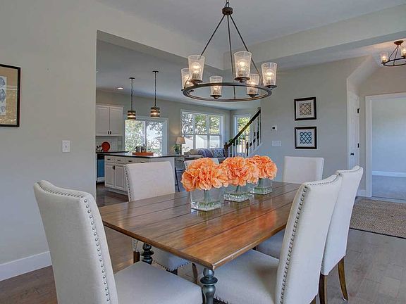 This 2-story home with inviting front porch includes a 2-car garage and 9' ceilings on first floor.. To the front of the home is a convenient flex space room. Stylish hardwood flooring in the foyer flows throughout most of the first-floor including the dining room, kitchen, and family room. The open kitchen with stainless steel appliances, quartz countertops with tile backsplash, includes an island with breakfast bar overhang for eat-in seating. Sliding glass doors open to the patio and provide plenty of natural light to both the kitchen and adjoining family room. The family room features triple windows and a gas fireplace with floor-to-ceiling stone surround. The 2nd floor boasts 4 bedrooms, 2 full baths, and a laundry room. The owner's suite includes a private bathroom with an expansive closet, double bowl vanity, and a 5' tile shower.