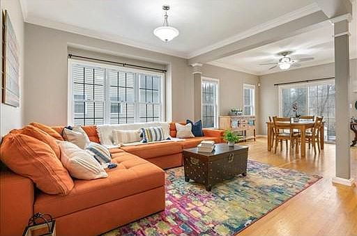 Welcome to The Village at Wildflower Green. Experience all the privacy and feels of a single family home without the yard work and maintenance. This beautiful freestanding townhome offers high ceilings throughout, crown molding, 3 levels of living space, and an open floor plan ideal for any living situation. Stunning hardwood floor throughout the 1st level, updated kitchen with granite countertops, newer stainless steel appliances, and large peninsula. Natural gas heat & fireplace help make this home cozy all year long. Upstairs offers 2 generous sized bedrooms and a master suite complete with double closets, ensuite bath with jacuzzi tub and oversized vanity. 2nd floor laundy and amazing closet systems throughout offer amazing storage in addition to the attached 2 car garage. The finished basement is ideal for your next home office, gym, media room and more. With over 2700 square feet of finished living space, there is still plenty of unfinished storage space. Welcome Home.