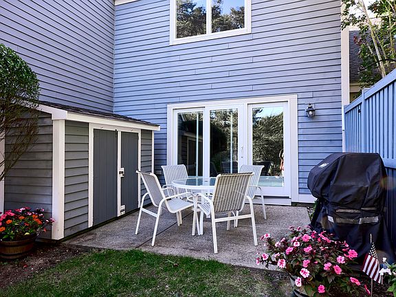 Welcome to 63 Trevor Lane, a ''C'' style townhome in Ocean Edge Resort. This property has enjoyed single ownership for 40 years. With plenty of natural light, this home has been thoughtfully updated over the years with a new storm door, newer wood laminate flooring, recessed lighting in the DR/LR and a dual inverter wall unit for heating and cooling. A newer Pella slider in the LR opens to a private patio with a beautiful expanse of lawn which is the perfect spot for enjoying morning coffee as well as for entertaining guests. This sale includes a patio table, chairs and Weber grille and a shed perfect for storage of bicycles, beach gear, etc. Half bath and kitchen countertops upgraded to granite. Upstairs you will find a closet with stackable washer dryer, full bath with recently remodeled walk in shower and 2 bedrooms. Both bedrooms have generous closet space and overhead fans. A pull down in the ceiling of the primary BR provides for additional storage. Optional Ocean Edge Resort memberships offer access to indoor and outdoor pools, fitness centers, golf course, private beach, tennis/pickleball courts. Furnishings in photos included. Seller is related to listing agent.