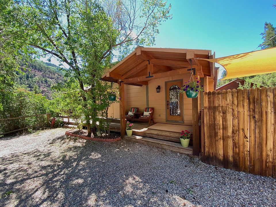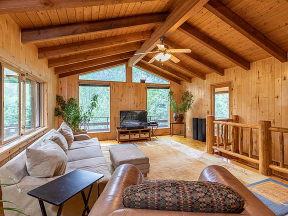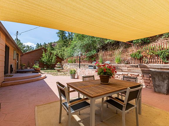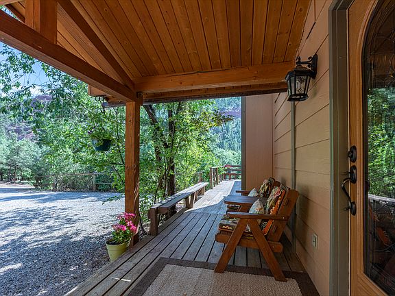Perched below the red rock cliffs of the Fall Creek River Canyon with end of the road privacy on 1.27 lushly wooded acres, this perfectly south facing residence is bathed in all sun. Owned by a couple with decades of property management and maintenance experience, the improvements are impeccably maintained. A fenced courtyard expands living areas to an expansive stamped concrete patio with built-in BBQ and an awning covered dining area. The interior is appointed with hardwood flooring, mahogany cabinetry, granite counter tops and stainless steel appliances. The tongue and groove paneled 1.5 half storied living room with expansive south facing window openings flows freely from the kitchen and generous lounging area with ample space for more formal dining.