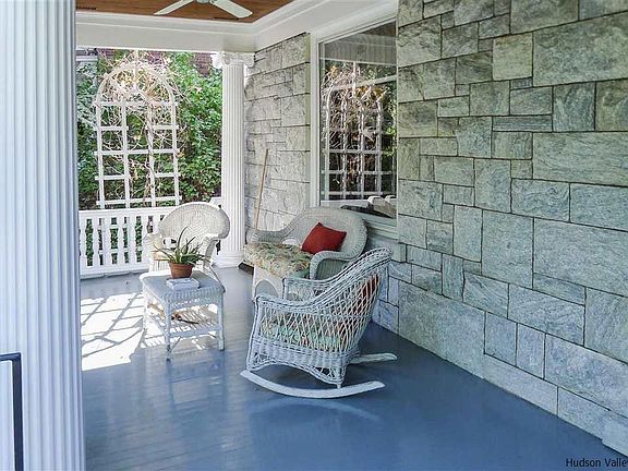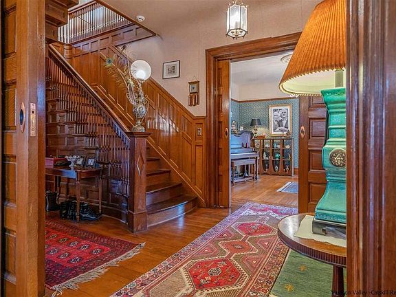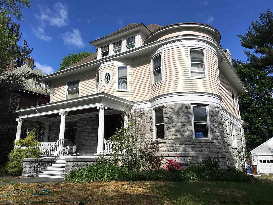 Enter into an open spacious foyer with grand central staircase to second floor. You will surely be taken by this historical Victorian. Formally owned by J. Townsend Johnson and designed by Charles Hillyer in 1899. Handsome craftsmanship and materials throughout. Ornate oak trim mantels, inlay floors, pocket doors and 2 ceramic fireplaces. Butlers pantry and servants staircase off kitchen. High ceilings and stained glass windows. Period details abound. 4800 square feet, plus basement provides 4 levels of great space that adapt to the occasion. Entertaining is a delight. 5 plus bedrooms for family and friends. Currently third level is used as a bedroom suite and finished basement provides space for a music studio. Enjoy covered porches, rear patio and decked pool. Off street parking with shared drive and 1 car garage. Come explore all this house has to offer. AAA location in the vibrant little city of Kingston. Minutes to the Rondout district and Hudson river