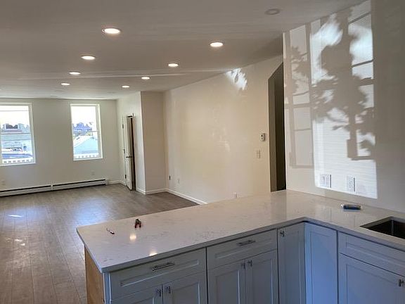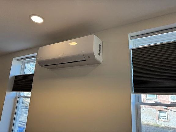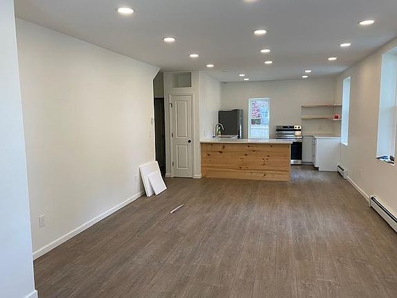 This late nineteenth century four story townhouse was recently gutted and renovated. Unit 1's spacious living space as high ceilings, large south and south/ east facing windows and is open to a kitchen with a fairly new fridge and electric range (about a year and a half old). Washer and dryer located in the downstairs hallway between bedrooms. One bedroom a little larger than the other; they are adjacent, and next week - the week before July 1 - Two 2' wide pocket doors are being installed, so the two rooms can be open to each other (a four foot wide doorway). This should make for some versatility. Downstairs rooms are close to a very small second bathroom. Split system - heat, ac, fan. Plus very effective baseboard heat - you can choose. One year old bluestone sidewalk. Not pictured here is a nice wood and glass door in the downstairs room. The apartment is in the historic Rondout section of Kingston, just around the corner from Cornell Park and the newly renovated, iconic Wurts Street Bridge - and the Wurts Street Bridge promenade, bordering the water. Close to shops, restaurants, and cafes such as Ship to Shore, Rosie General, Kingston Wine Co., Armadillo, Brunette Wine Bar, Clove & Creek. Music events and festivals are frequent, and during many months there is a weekly farmers market. It's a great neighborhood. Unit has its own meter. Landlord will (eventually) live one block away. Renter responsible for gas and electric. No smoking anywhere on property. 12 month lease. Last months rent due upon signing. Parking on street. As for pets, a small dog is fine if it is a calm, non-yapping dog; it's mostly a noise issue.